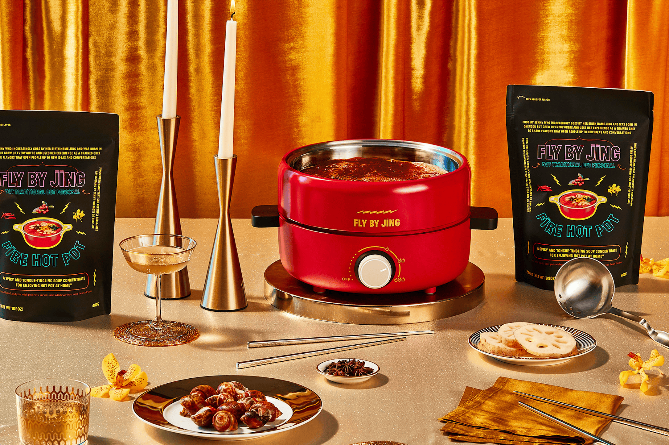 It’s a complete at-home hot pot experience featuring Fly By Jing’s signature Fire Hot Pot Base, paired with a branded red electric hot pot, designed for Sichuan-inspired flavor you can’t find anywhere else.