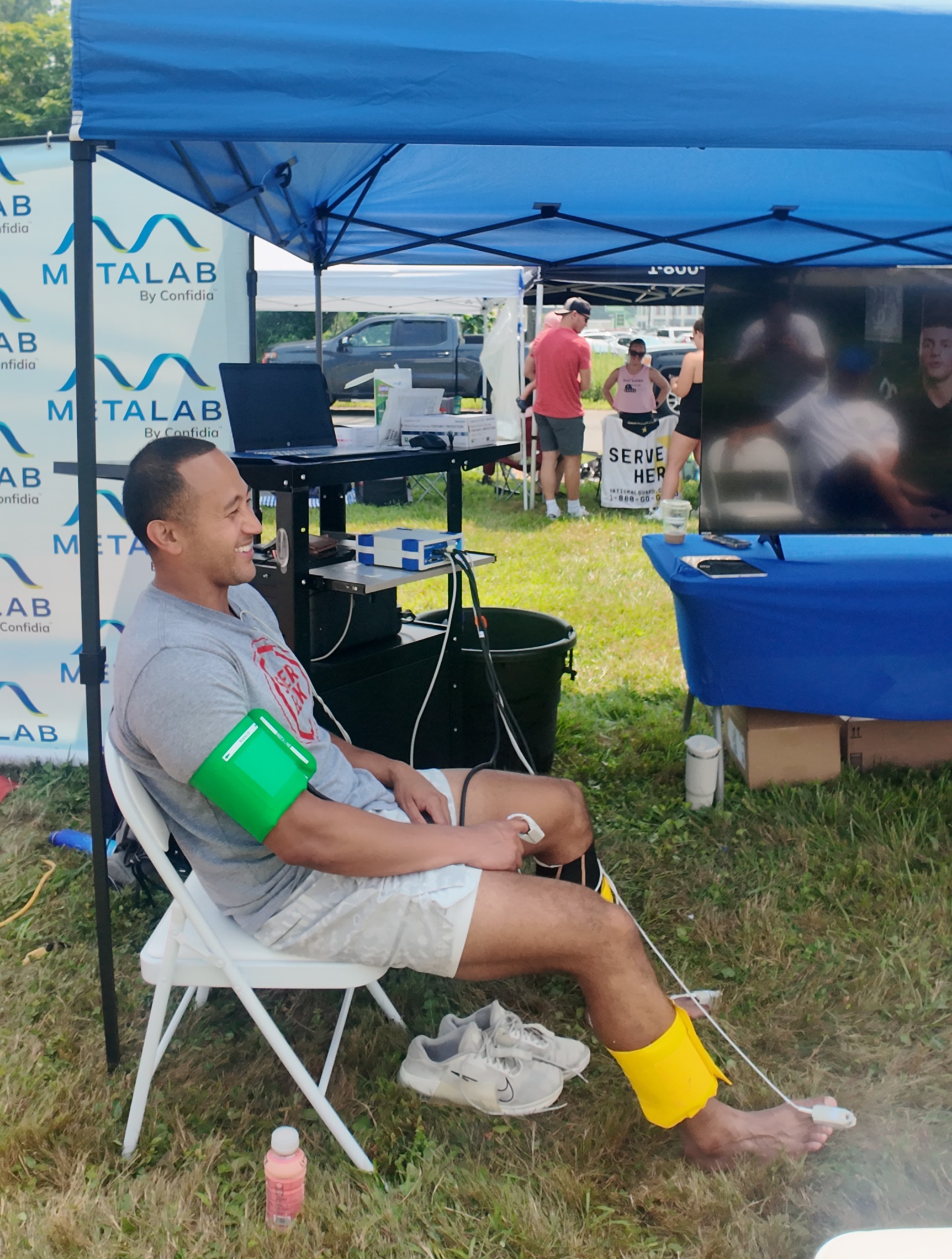 Dr. Kevin Greene, founder of Confidia Health, participates in ANS (Pulse Wave Analysis) testing at the MetaLab by Confidia booth during the Factory Summer Slam CrossFit event.